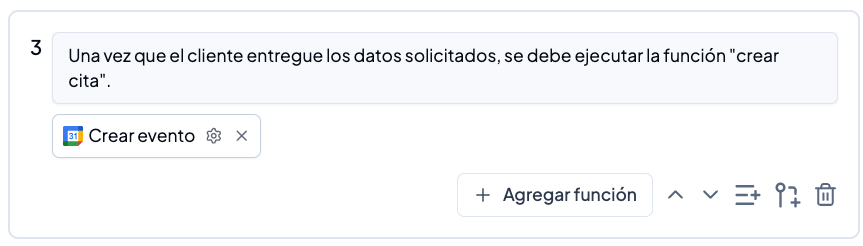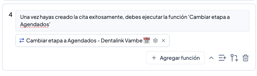 Una vez creada la cita exitosamente, debes ejecutar la función Cambiar de etapa a Agendados. Recuerda colocar la función ‘Cambio de etapa’.