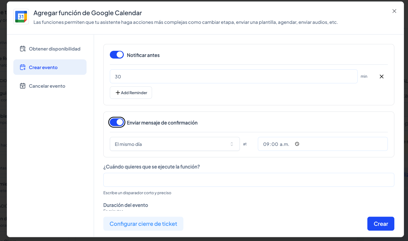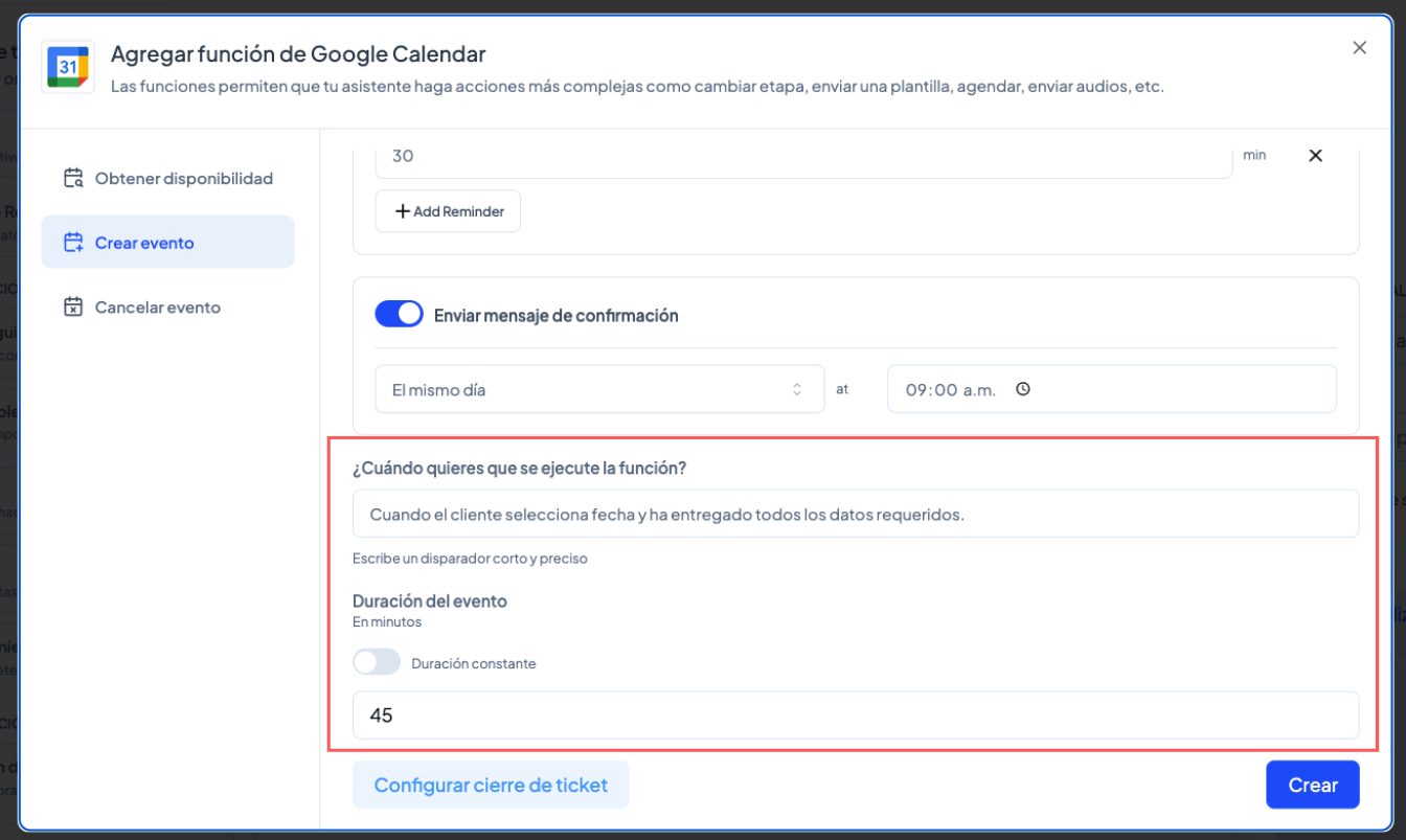 Configuración de la función “Crear evento”