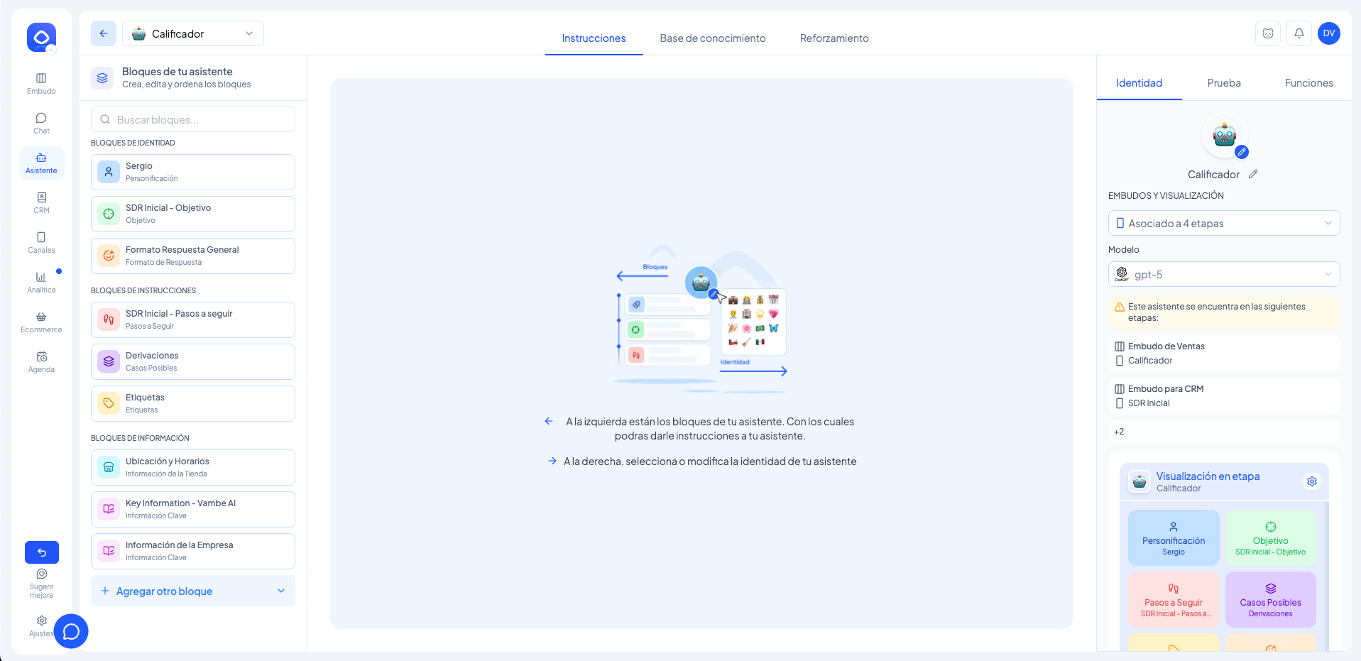 Una vez realizado este último paso, estarás dentro del asistente asociado a esa etapa y podrás modificar sus bloques, funciones e instrucciones.