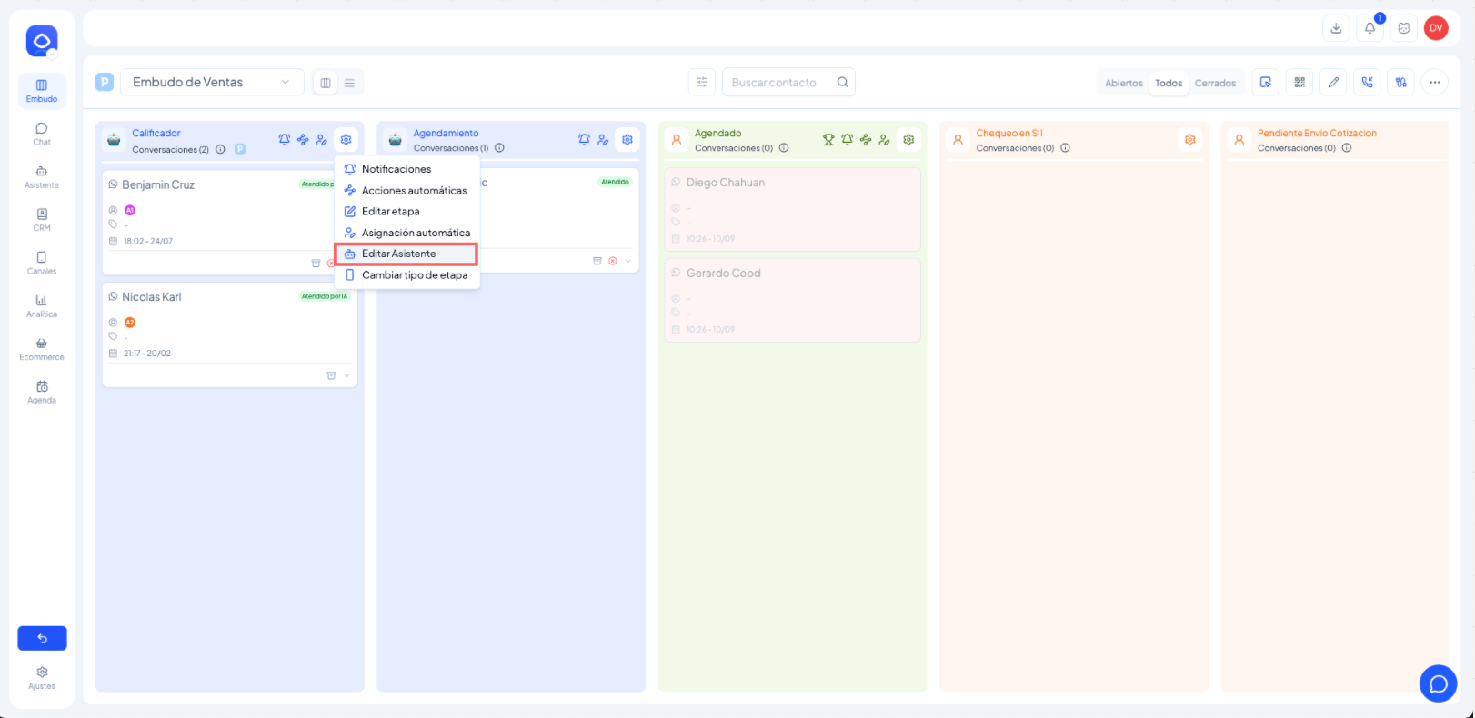 Si el asistente está vinculado a una etapa específica, el acceso se realiza directamente desde el embudo.