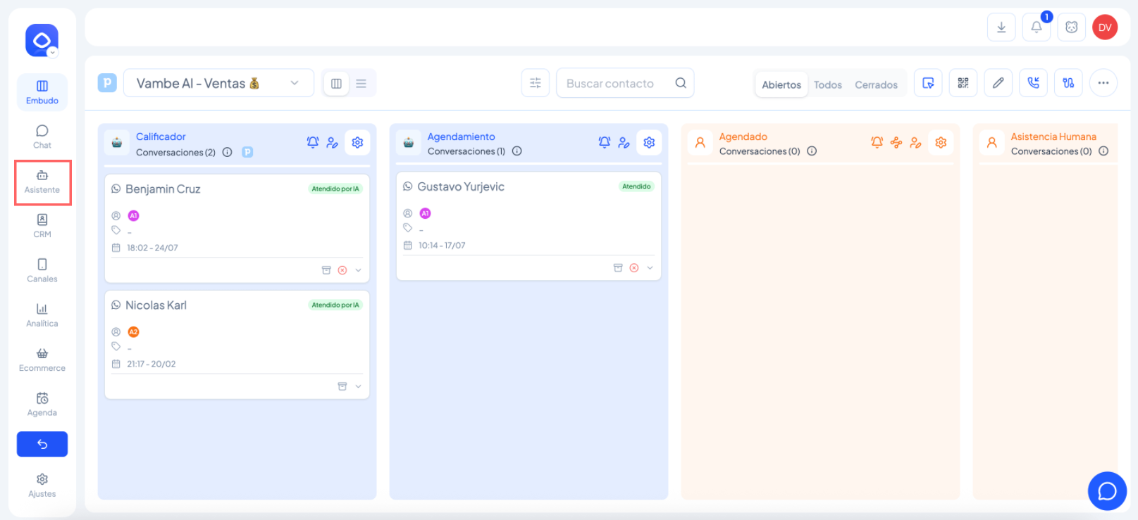 En Vambe existen dos formas de acceder a un asistente de Inteligencia Artificial, dependiendo de si ese asistente está asignado a una etapa del embudo o si es un asistente independiente que no está vinculado a ninguna etapa.