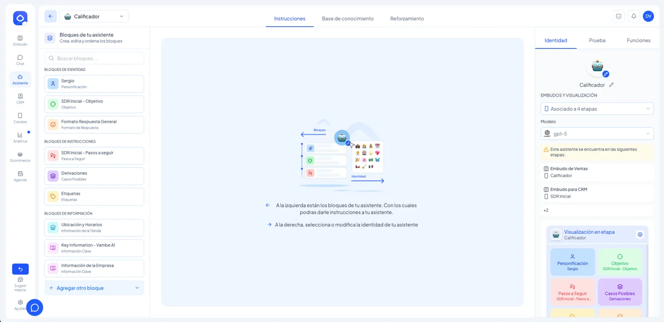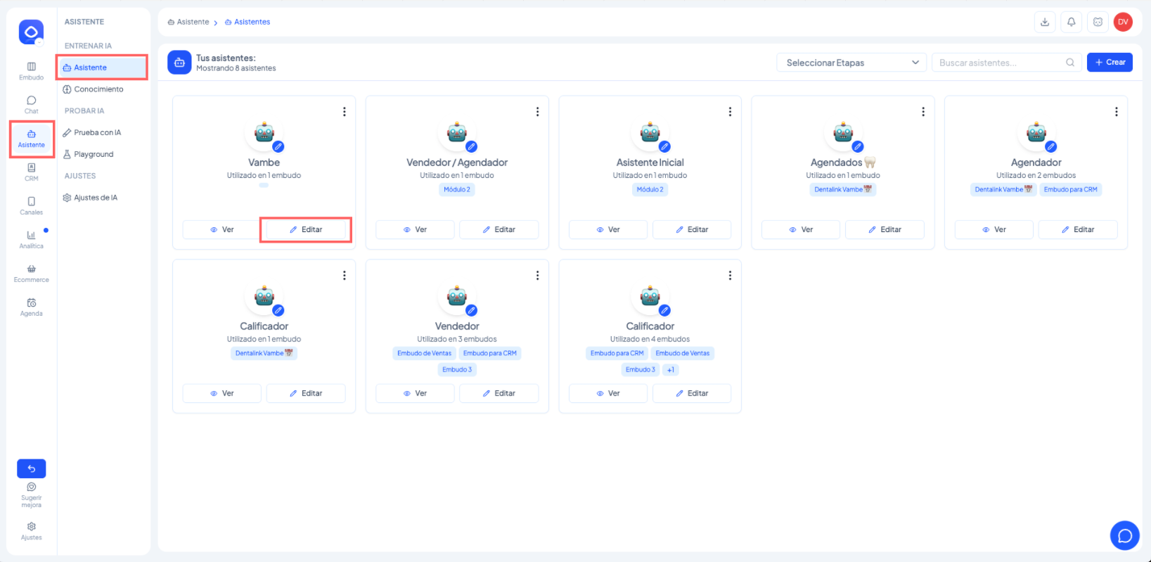 Vambe también permite crear asistentes independientes que no están directamente vinculados a etapas de un embudo. Para acceder a ellos, se debe utilizar el menú general de asistentes.
