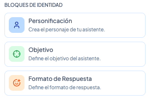 Importante: Estos tres bloques no pueden repetirse: un asistente solo puede tener una única personificación, un único objetivo y un único formato de respuesta.