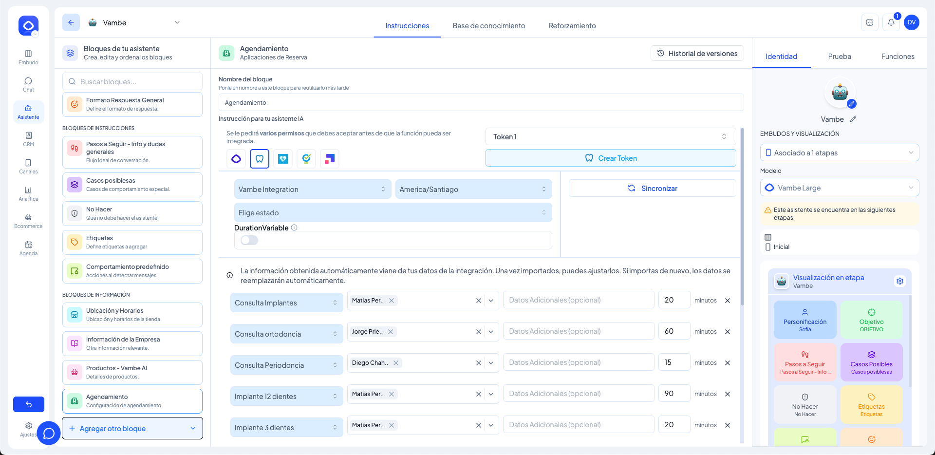 Se utiliza cuando el negocio tiene un sistema de agendamiento integrado (Dentalink, Medilink, Reservo, AgendaPro o agendamiento nativo de Vambe). Habilita consultar disponibilidad en tiempo real, buscar horarios según profesional, ver tratamientos y duraciones, crear reservas desde Vambe y coordinar citas dentro de la conversación.
