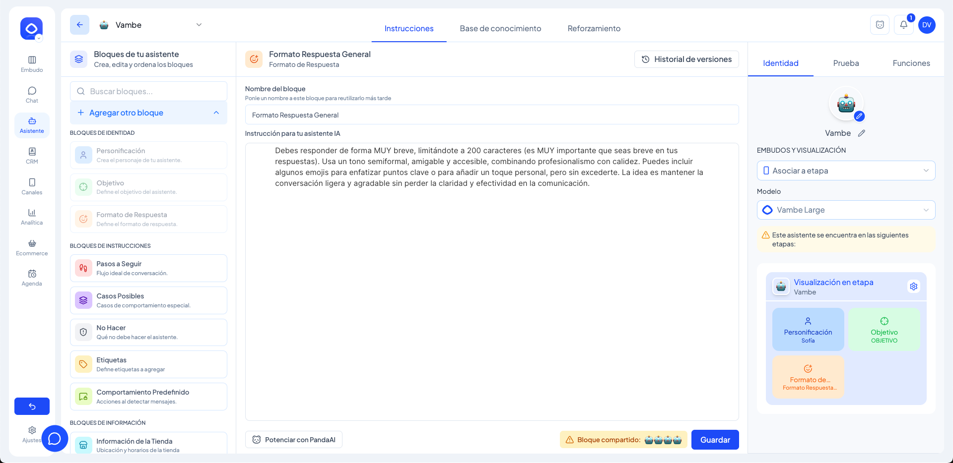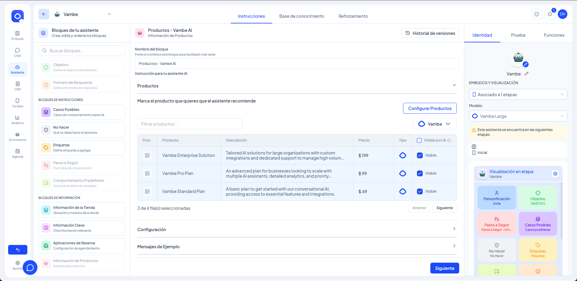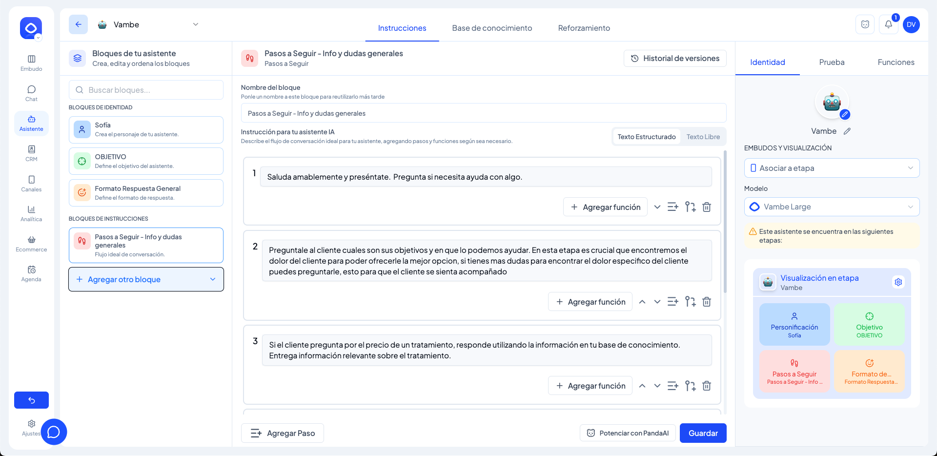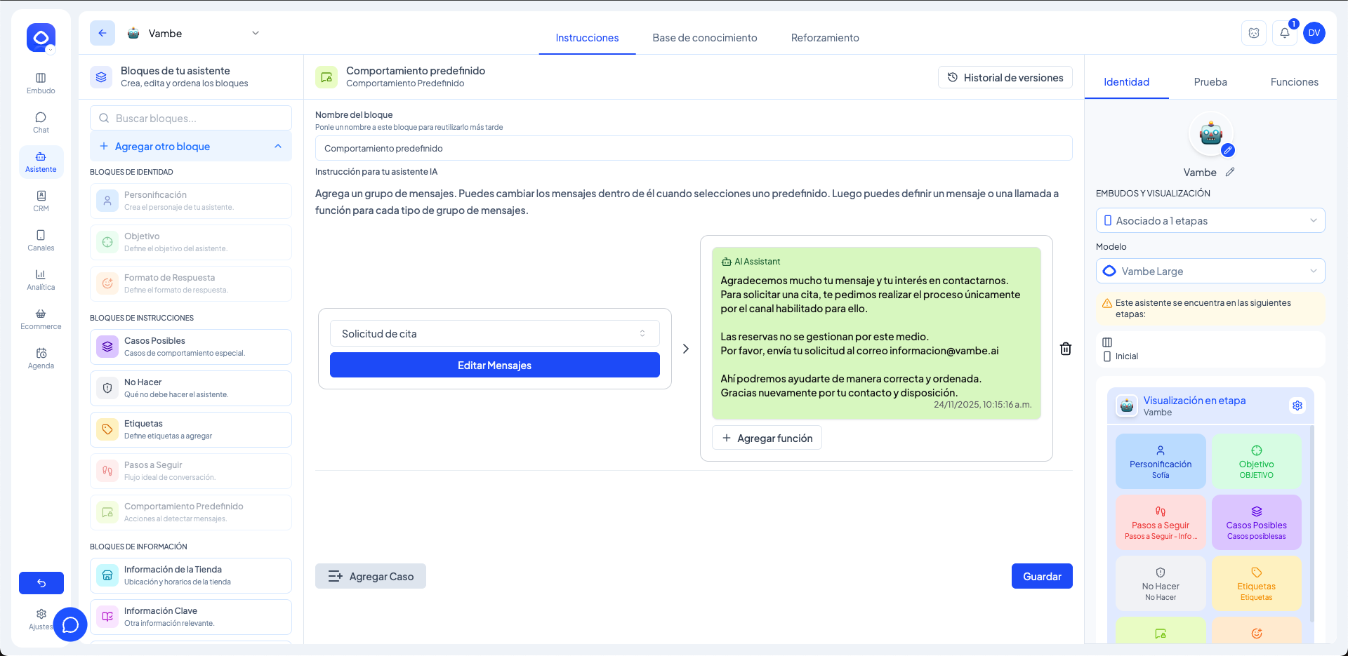 Un asistente de inteligencia artificial en Vambe es una configuración compuesta por múltiples bloques que, en conjunto, definen cómo piensa, responde, actúa y procesa la información un asistente dentro de un embudo.