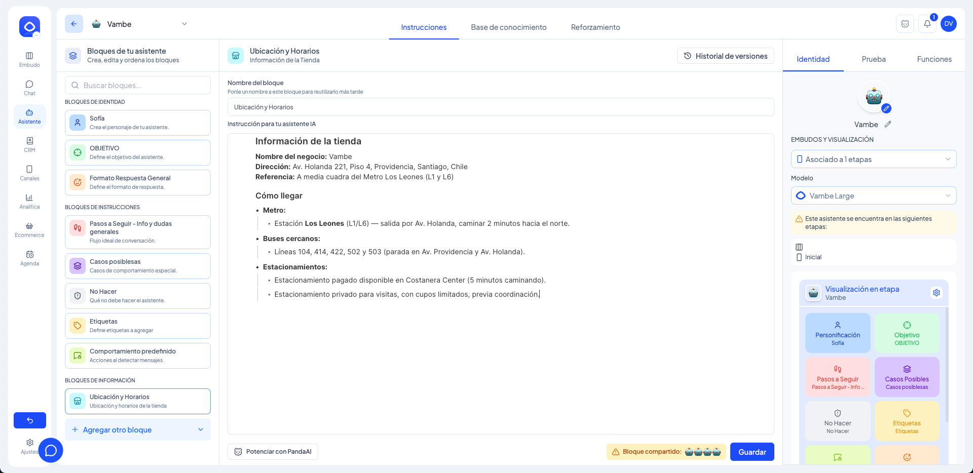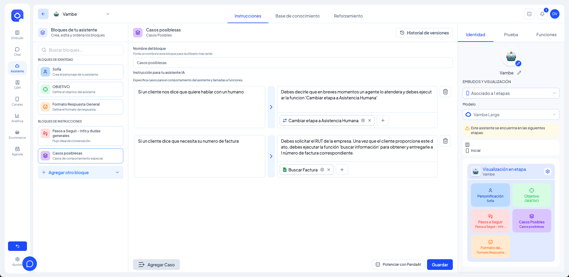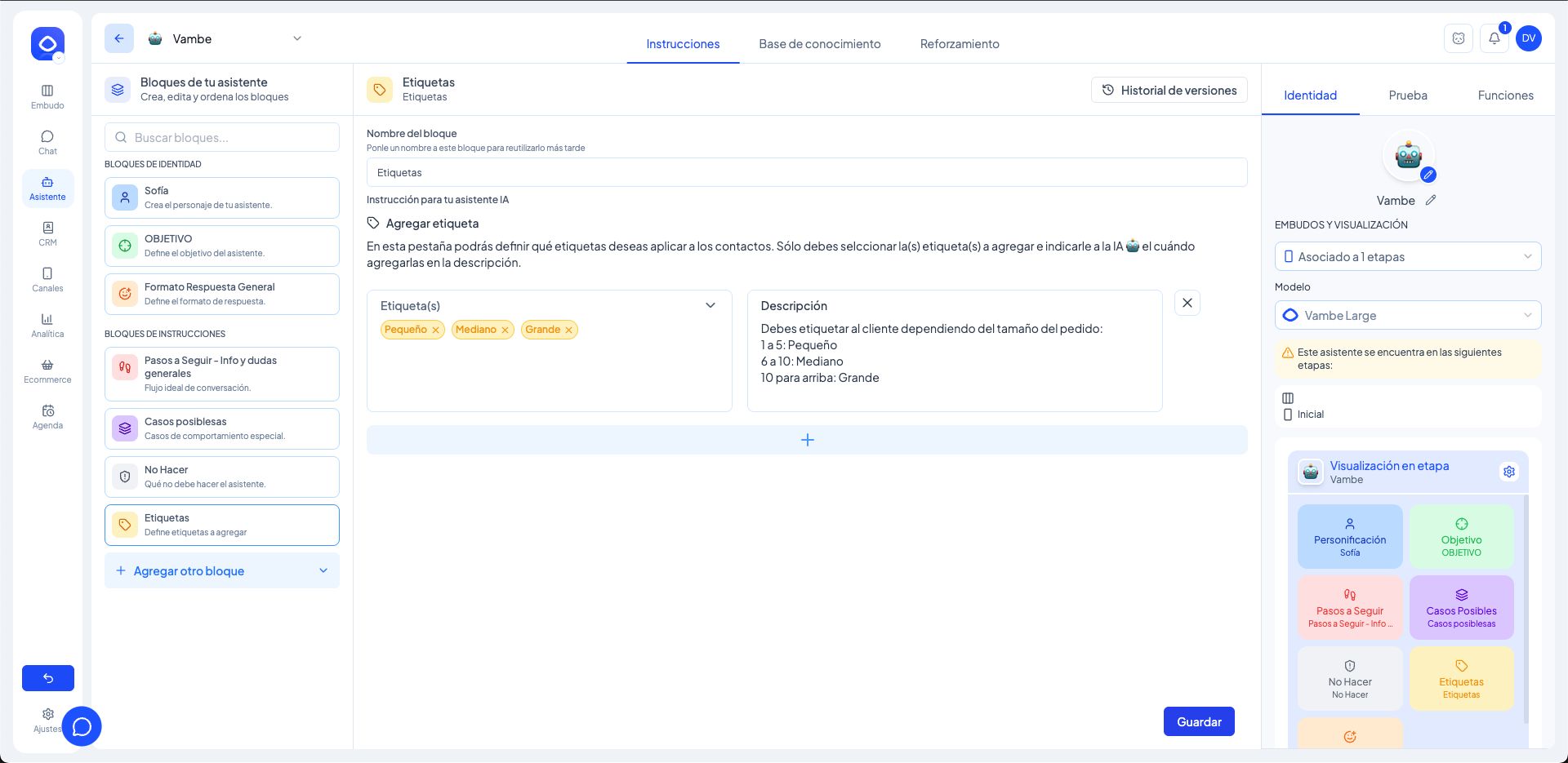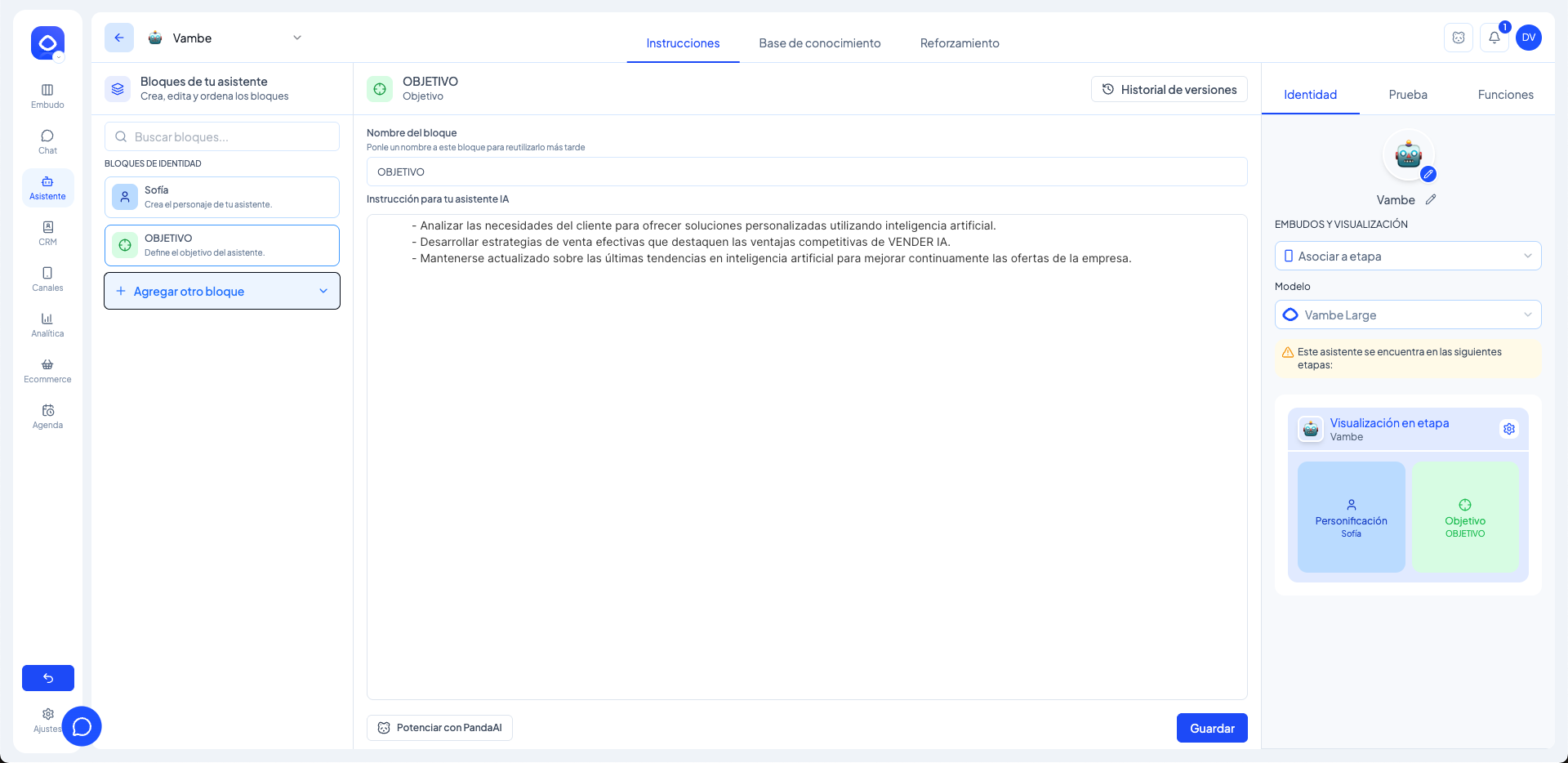 Un asistente de inteligencia artificial en Vambe es una configuración compuesta por múltiples bloques que, en conjunto, definen cómo piensa, responde, actúa y procesa la información un asistente dentro de un embudo.