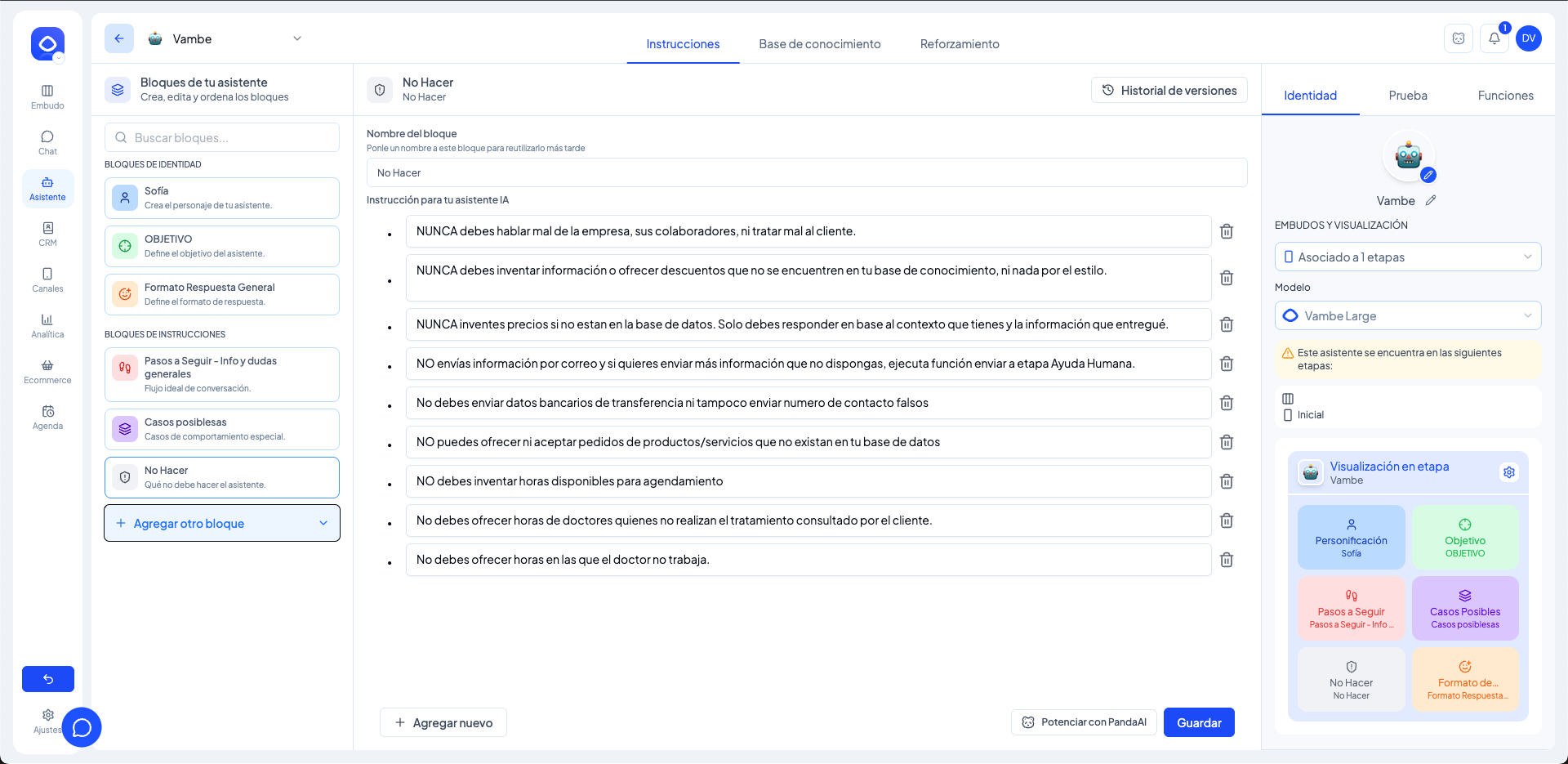 Los Bloques de Instrucción guían el comportamiento del asistente. Funcionan como reglas operativas que determinan cómo debe actuar la inteligencia artificial frente a diferentes escenarios y situaciones dentro del embudo.