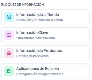 Espacio para texto libre con información relevante y personalizada: FAQ, políticas internas, reglas operativas, promociones, instrucciones internas, detalles sobre procesos y requisitos. Se pueden tener múltiples bloques de información clave para organizar por temas.