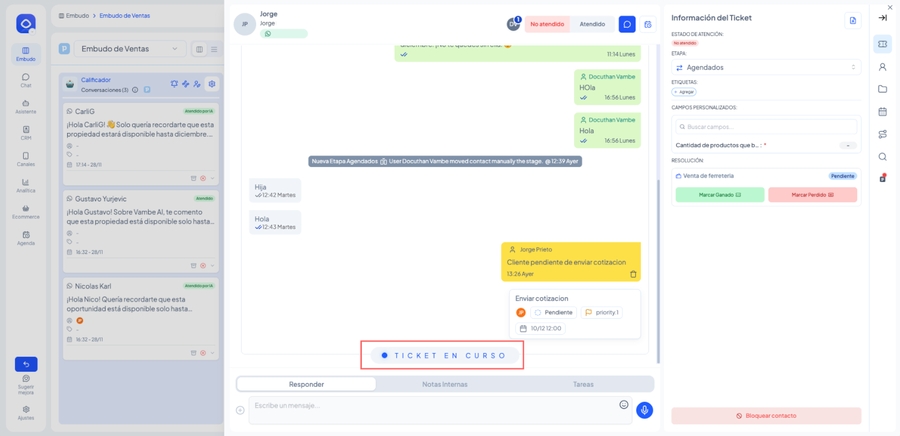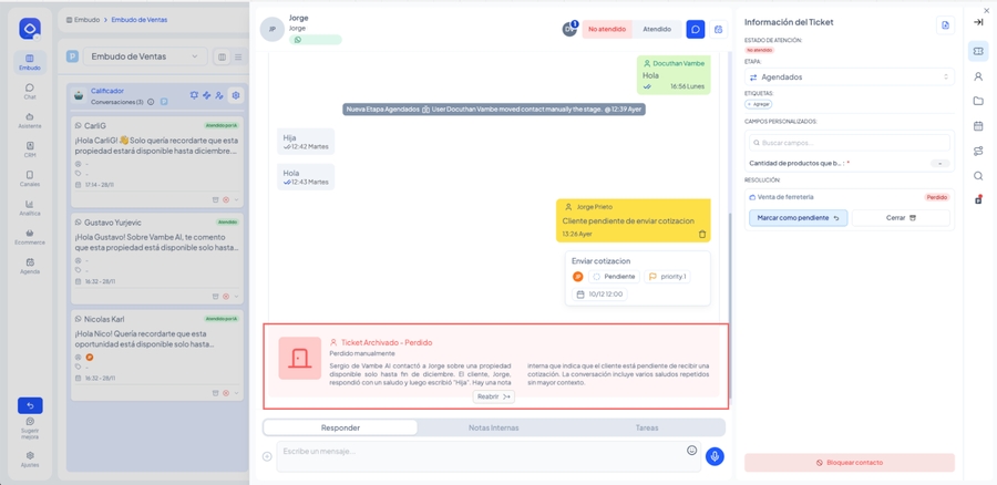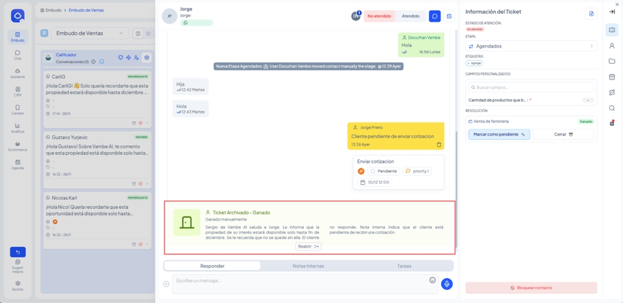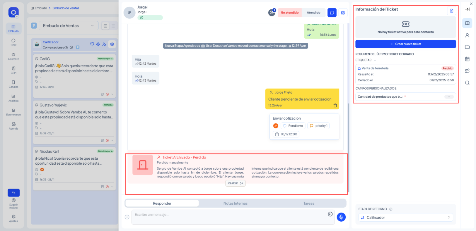 Cerrar un ticket ayuda a mantener limpio el embudo y permite reiniciar el proceso cuando el cliente vuelva a interactuar.