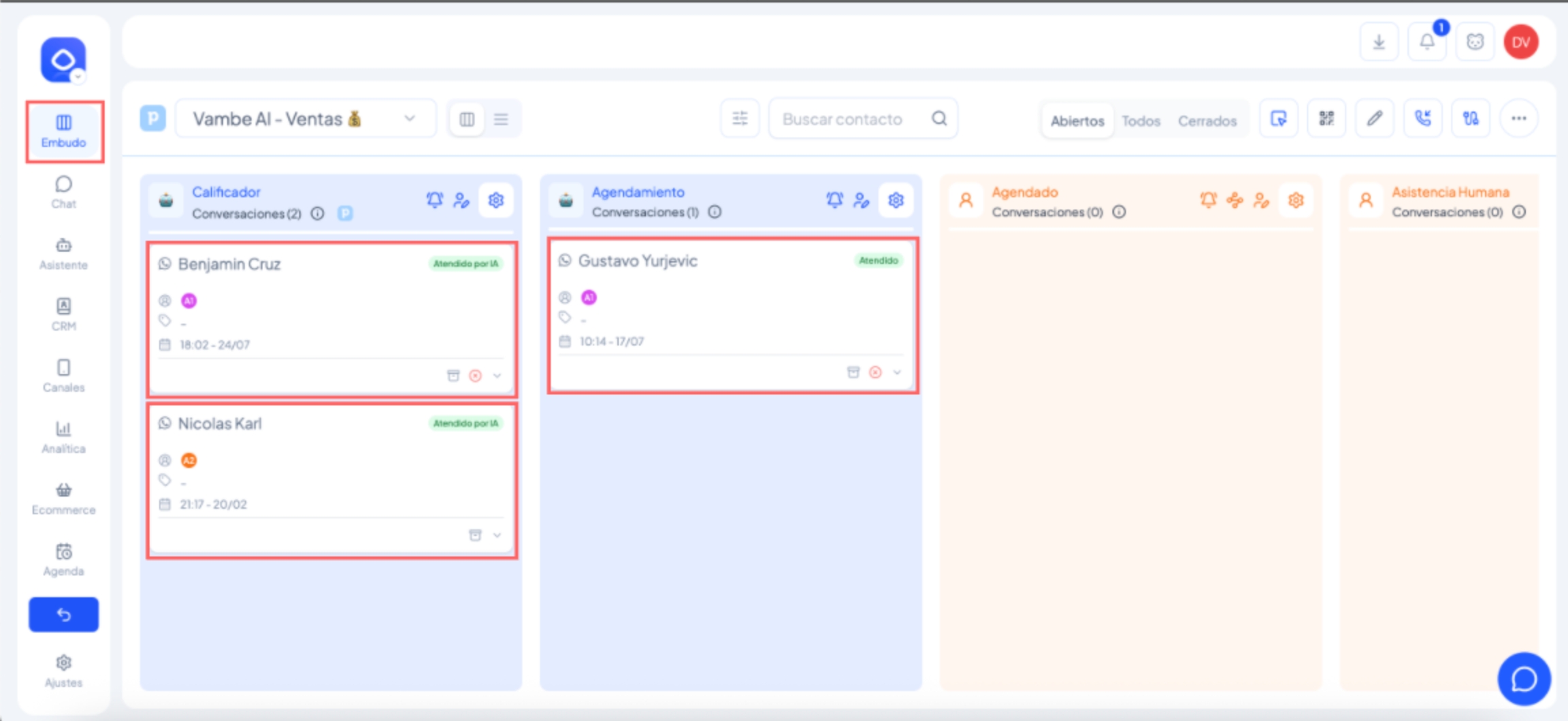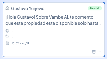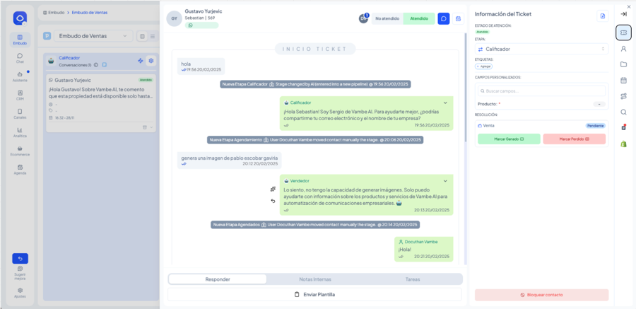 Los ticket se ven reflejados en Vambe una tarjeta en nuestro embudo cuando es creado