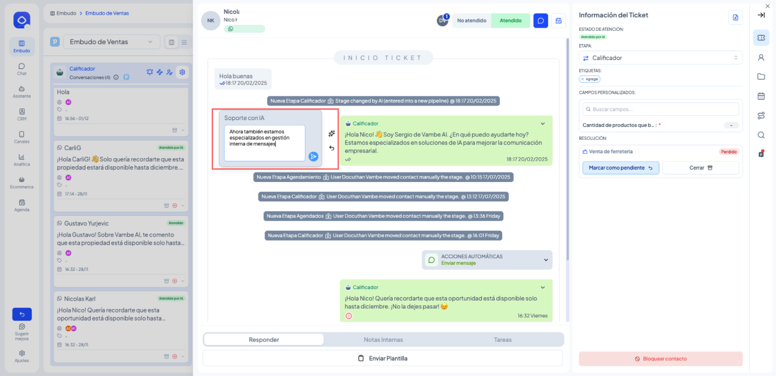 Dentro del ticket, identifica el mensaje enviado por la IA que deseas corregir.
