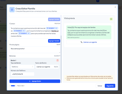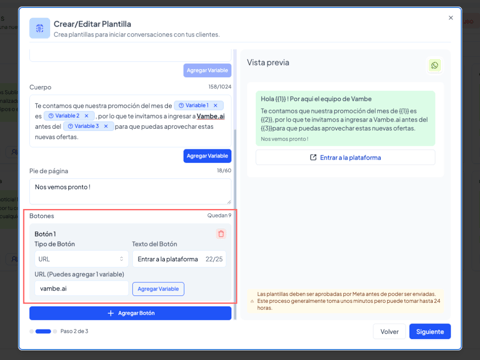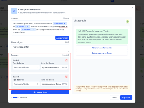 Al habilitarla, Vambe envía automáticamente la plantilla a revisión de Meta.