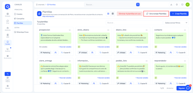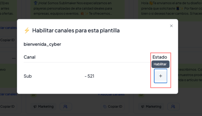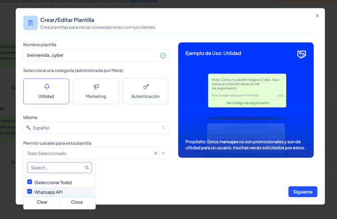 Seleccionar el canal donde quieres usar la plantilla (por ejemplo, WhatsApp API).