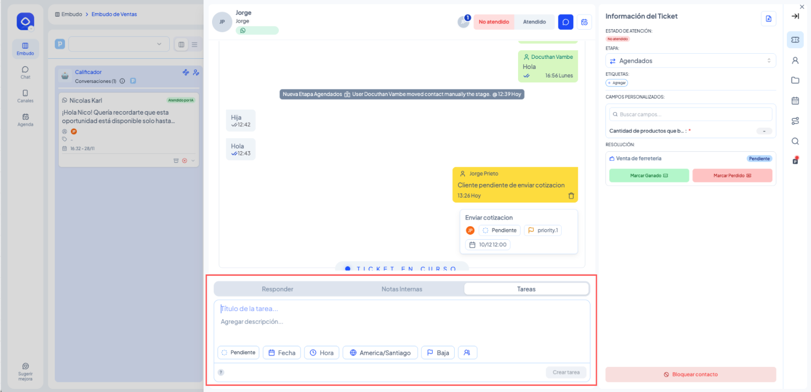 Las tareas permiten ordenar el flujo de trabajo sin afectar la conversación con el cliente.