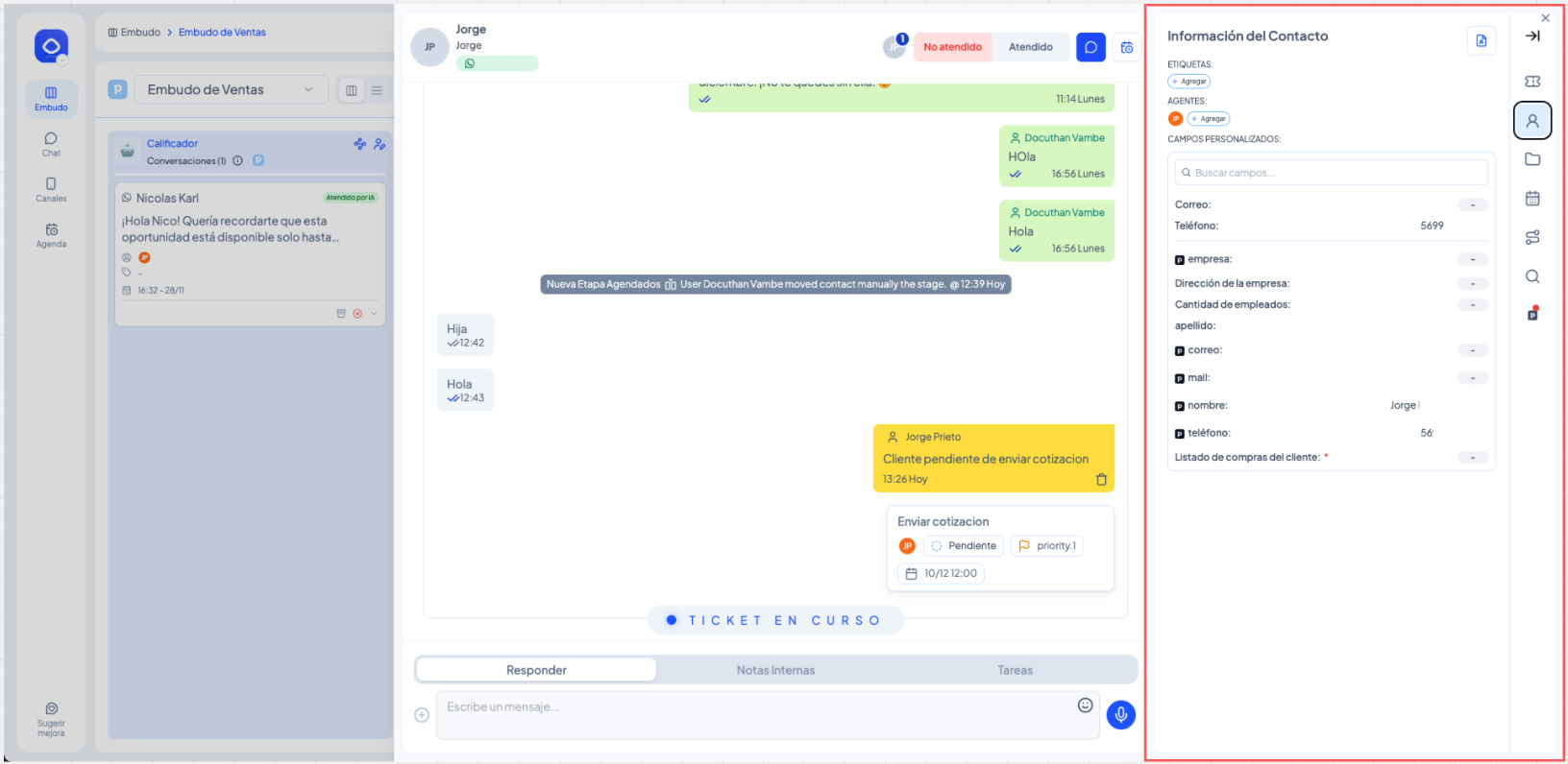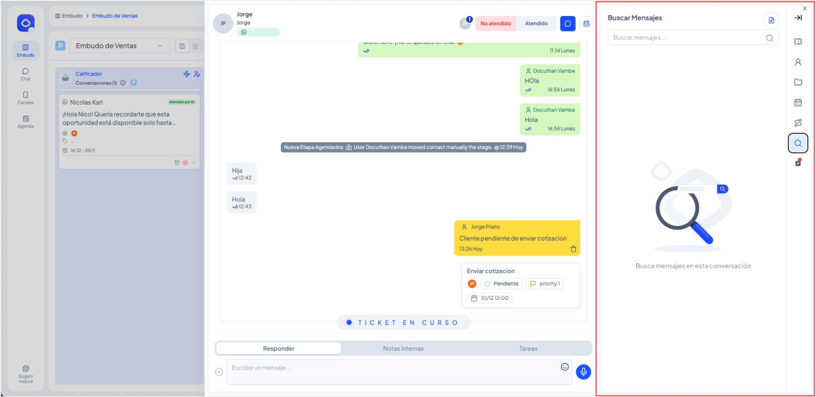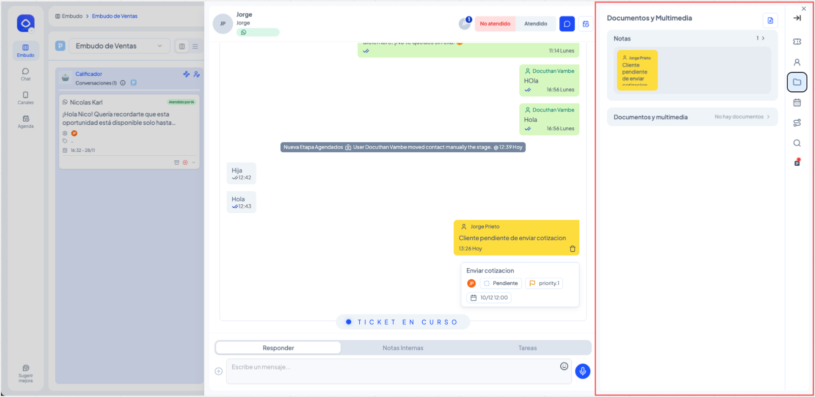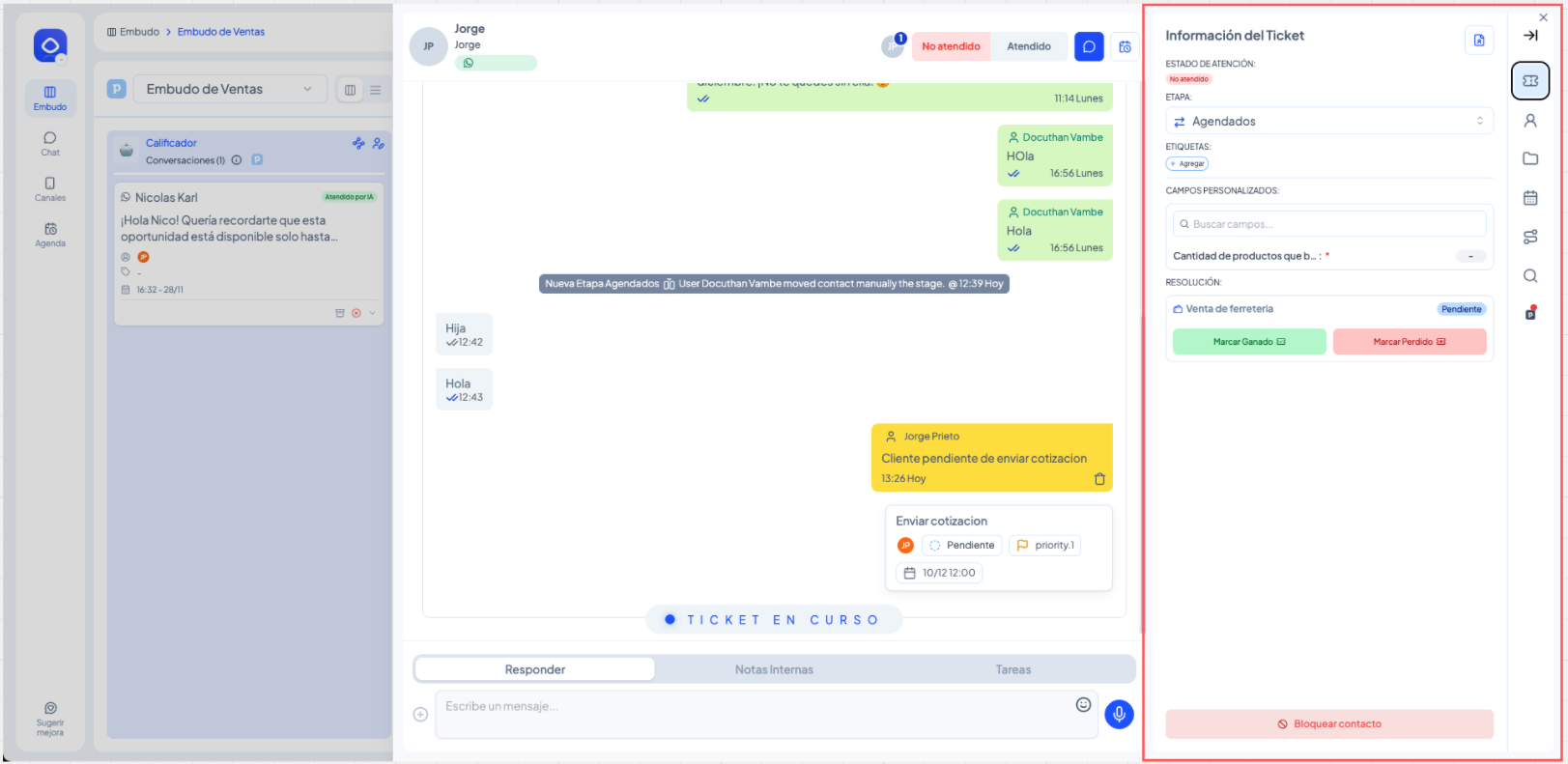 Este artículo explica cómo un agente puede responder mensajes, dejar notas internas y gestionar tickets dentro de un embudo. Está diseñado para cualquier usuario del equipo que atiende contactos en etapas humanas.