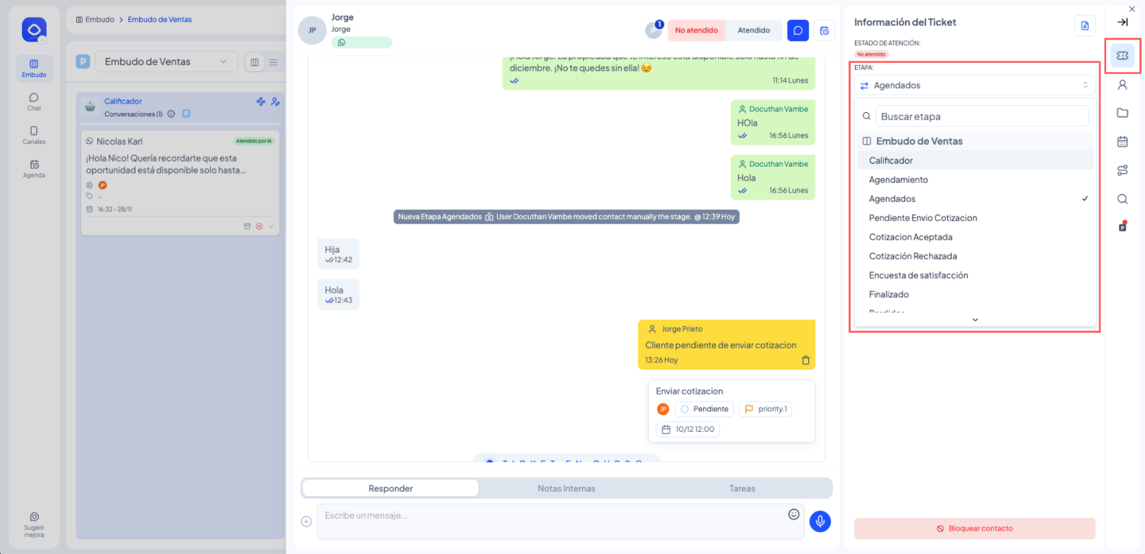 Desde el embudo, arrastra el ticket hacia la etapa deseada.