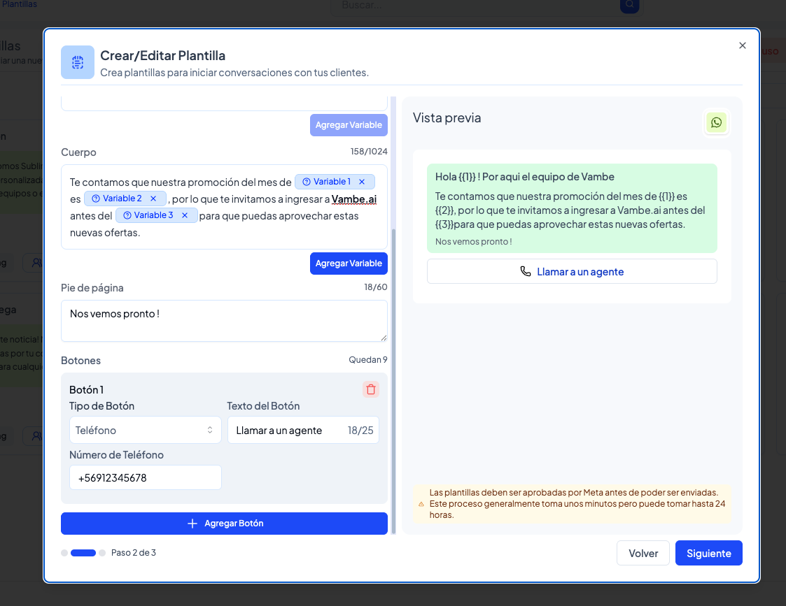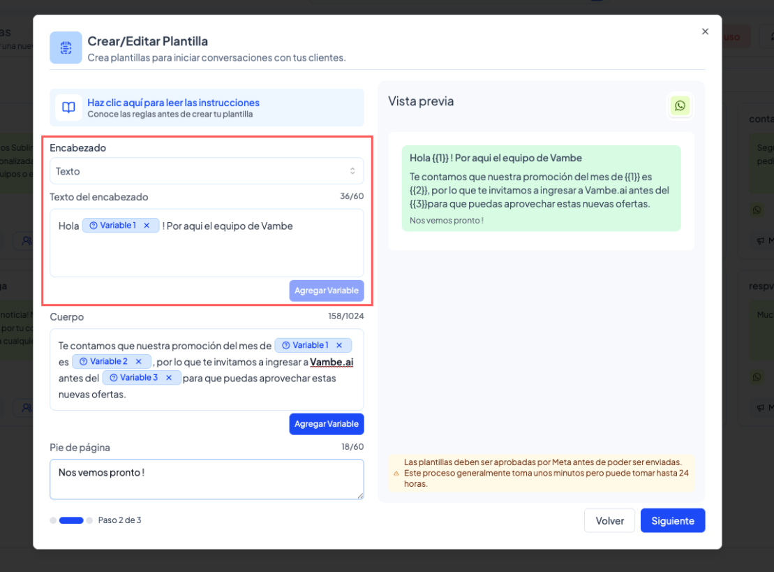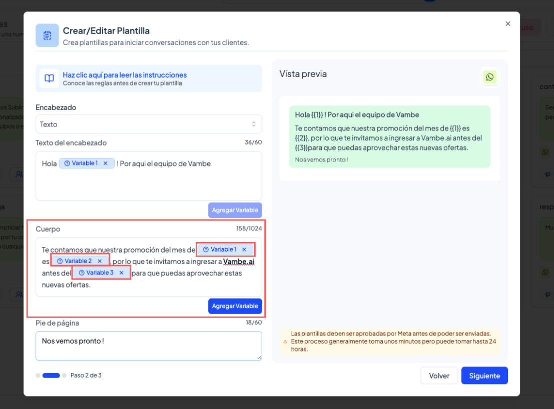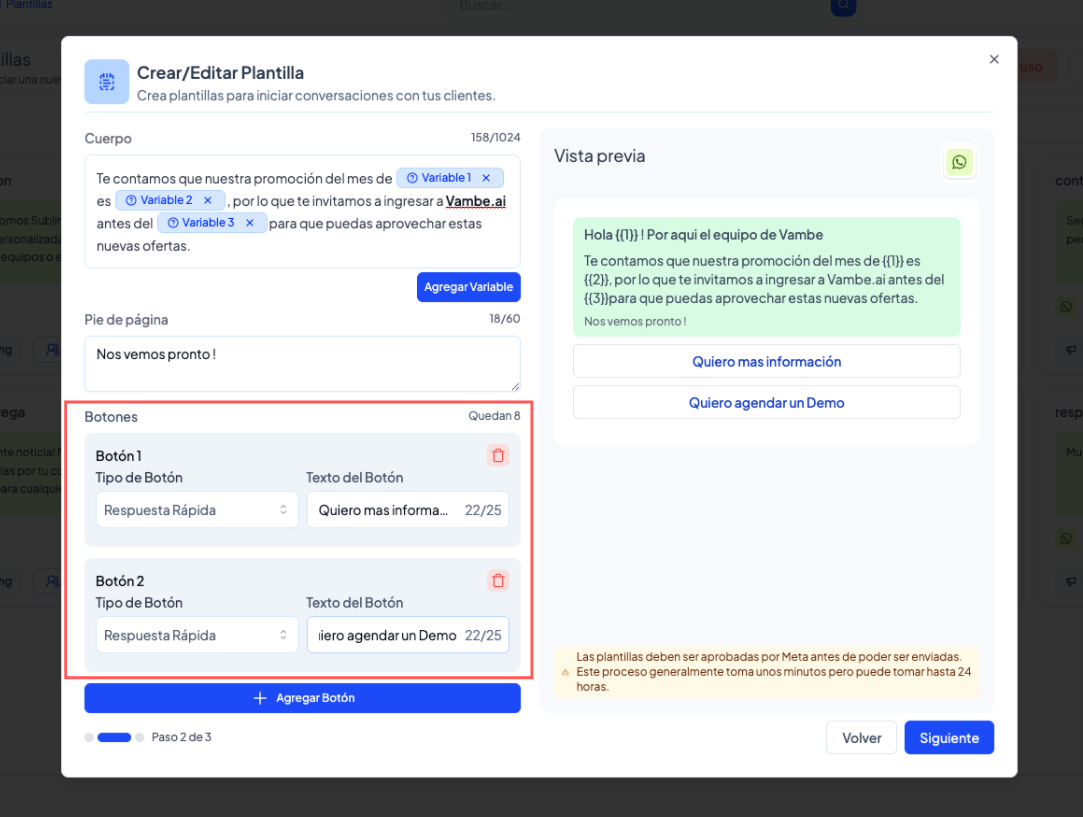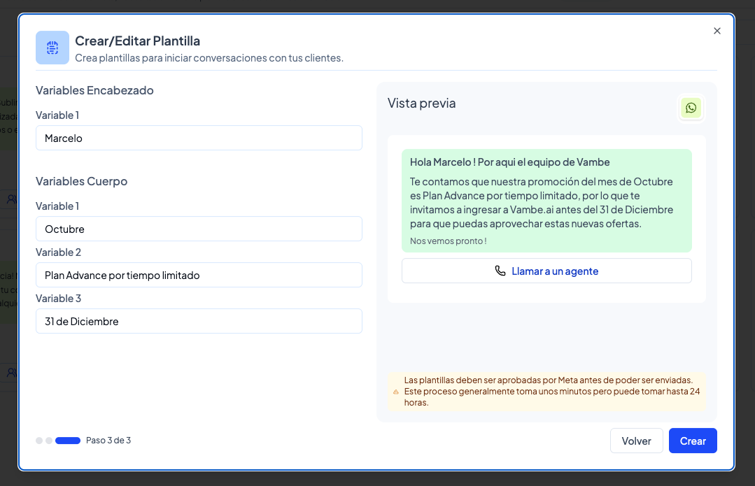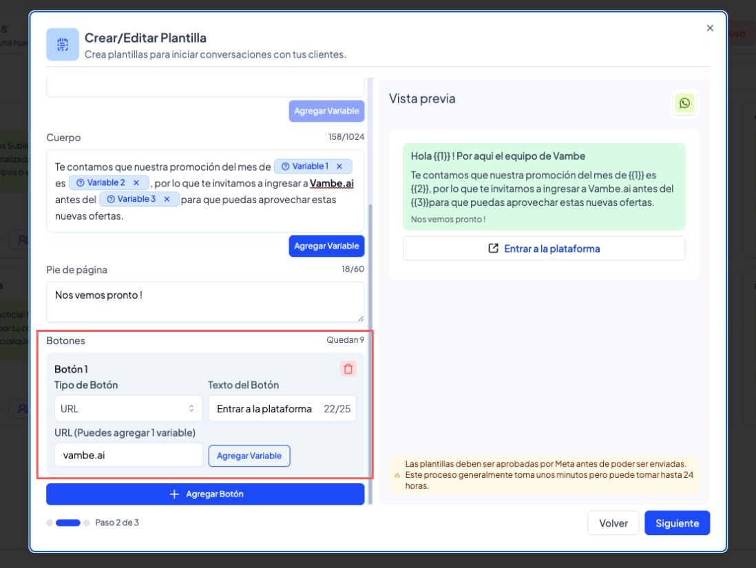 • Al habilitarla, Vambe envía automáticamente la plantilla a revisión de Meta.