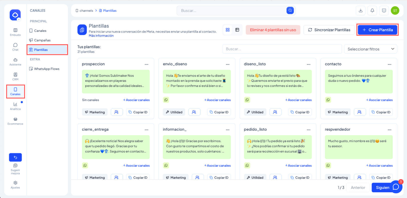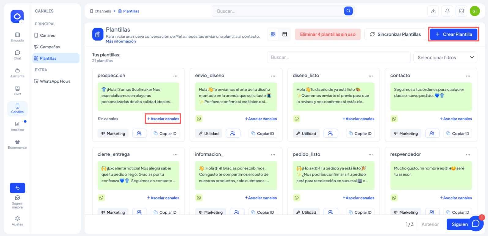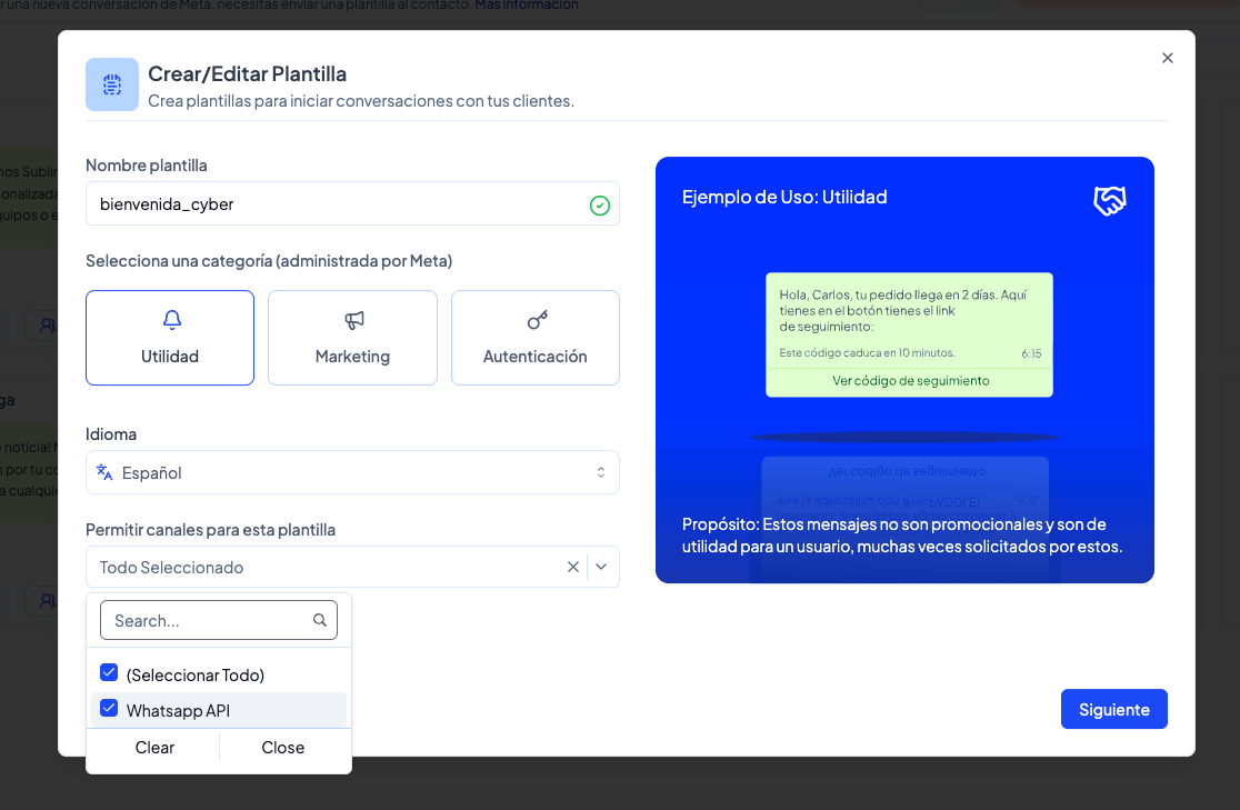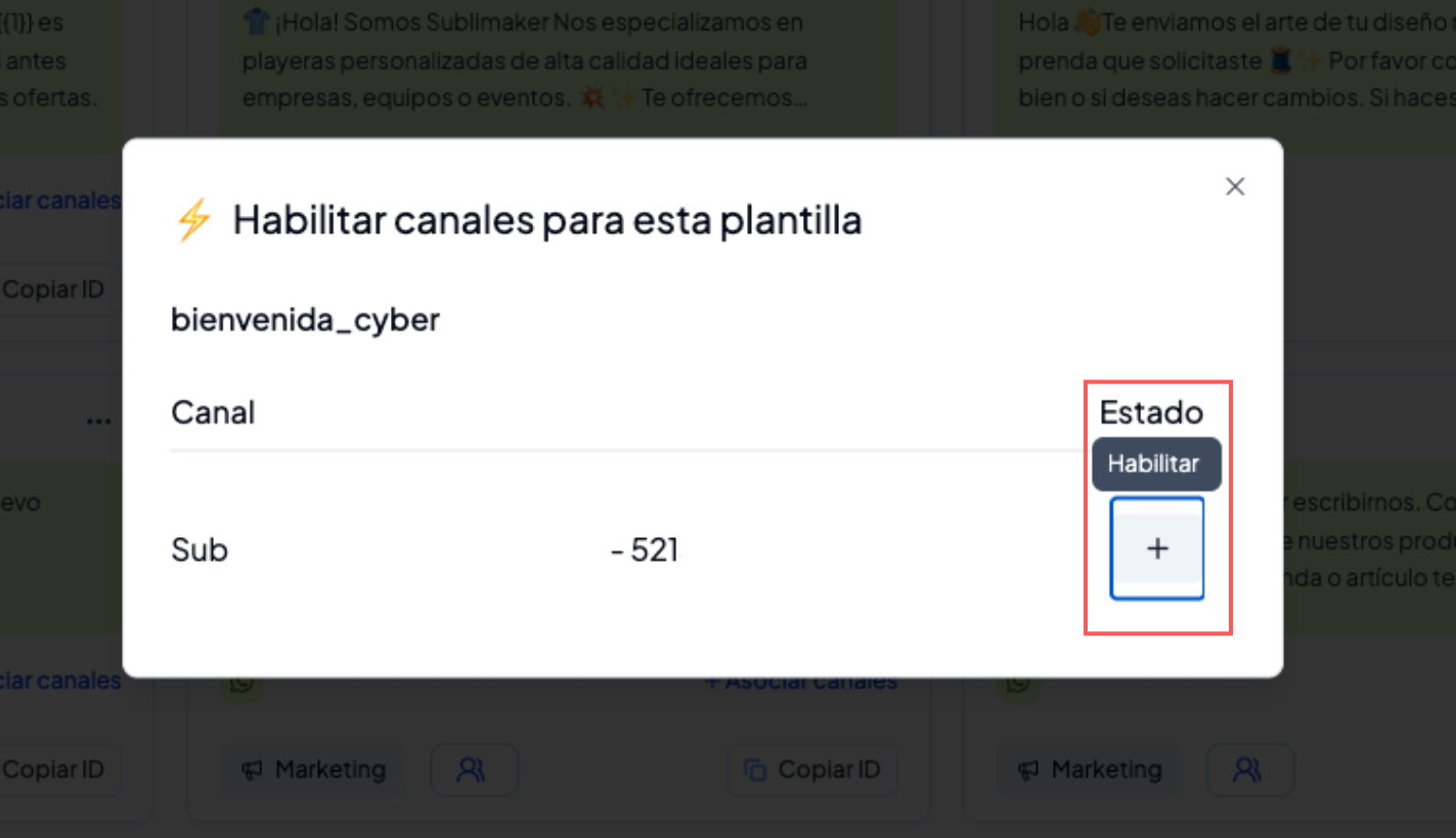 • Seleccionar el canal donde quieres usar la plantilla (por ejemplo, WhatsApp API).